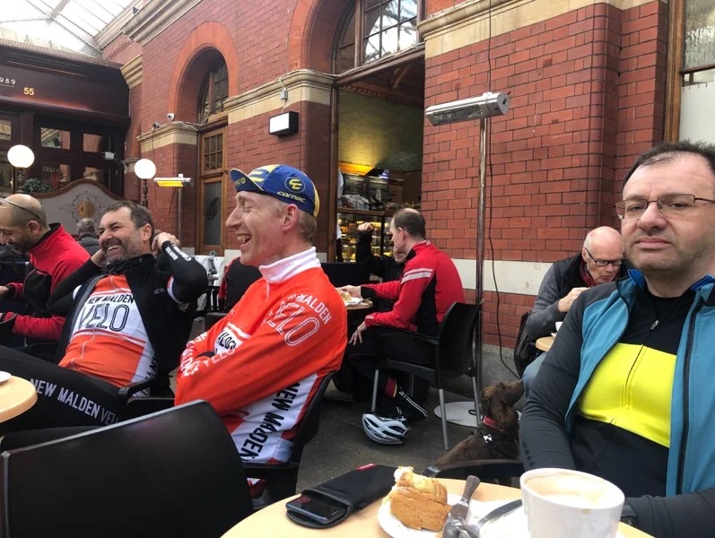 New Malden Velo cycling club members following the London to Brighton to London ride enjoying a well deserved pint